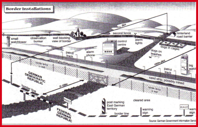 They had much to overcome. Some considerable distance from the actual border was the main fence, which was more substantial than the one visible from the West. Between the two 'fences' were mines, guard dogs on loose chains many metres long, surveillance towers, electronic devices, self-firing machine guns. There were intensive motorised patrols of the Grenzetruppe of the Nationalen Volksarmee and by the Grenzberietschaft of the Volkspolizie, (border troops and border police), who by regulation could never be more than a set number of minutes distant from any point in the fence. And there were other even more specialised units, such as the special forces trained Aufklarer. While the border control zone extended for five kilometres for five kilometres beyond that there was a heavily policed exclusion zone, entry into which was also controlled. It would have been in this zone that the 3,984 referred to above would have been caught.