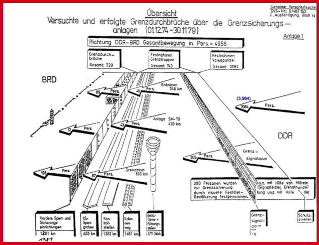 This secret map prepared by the East German Border Police in 1979 reports on the outcome of 4,956 known escape attempts. Of that number 3,984 (fig highlighted above) were apprehended prior to them reaching the innermost (or hinterland) border. 743 were caught in the kill zone. 229 made it to the West.